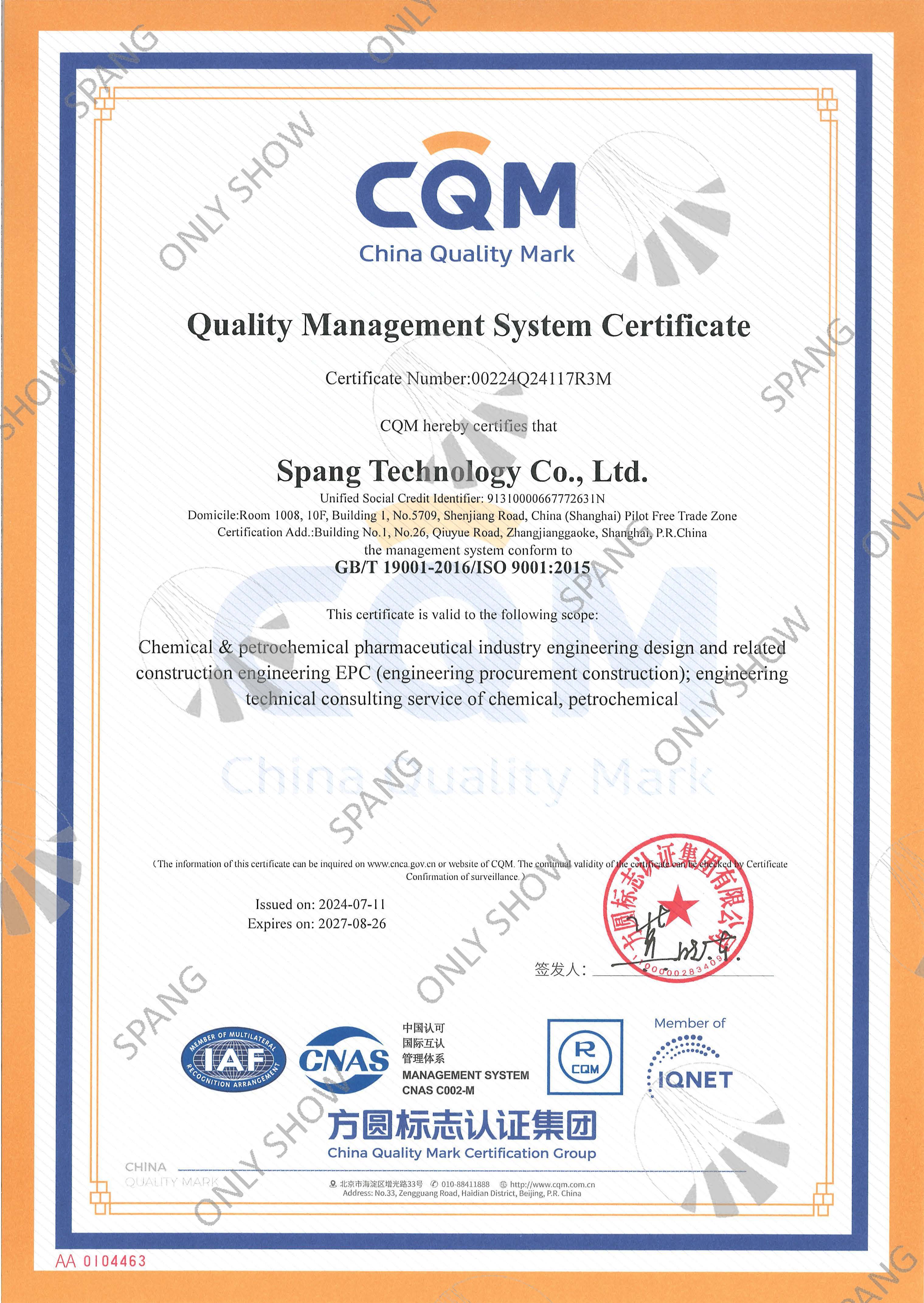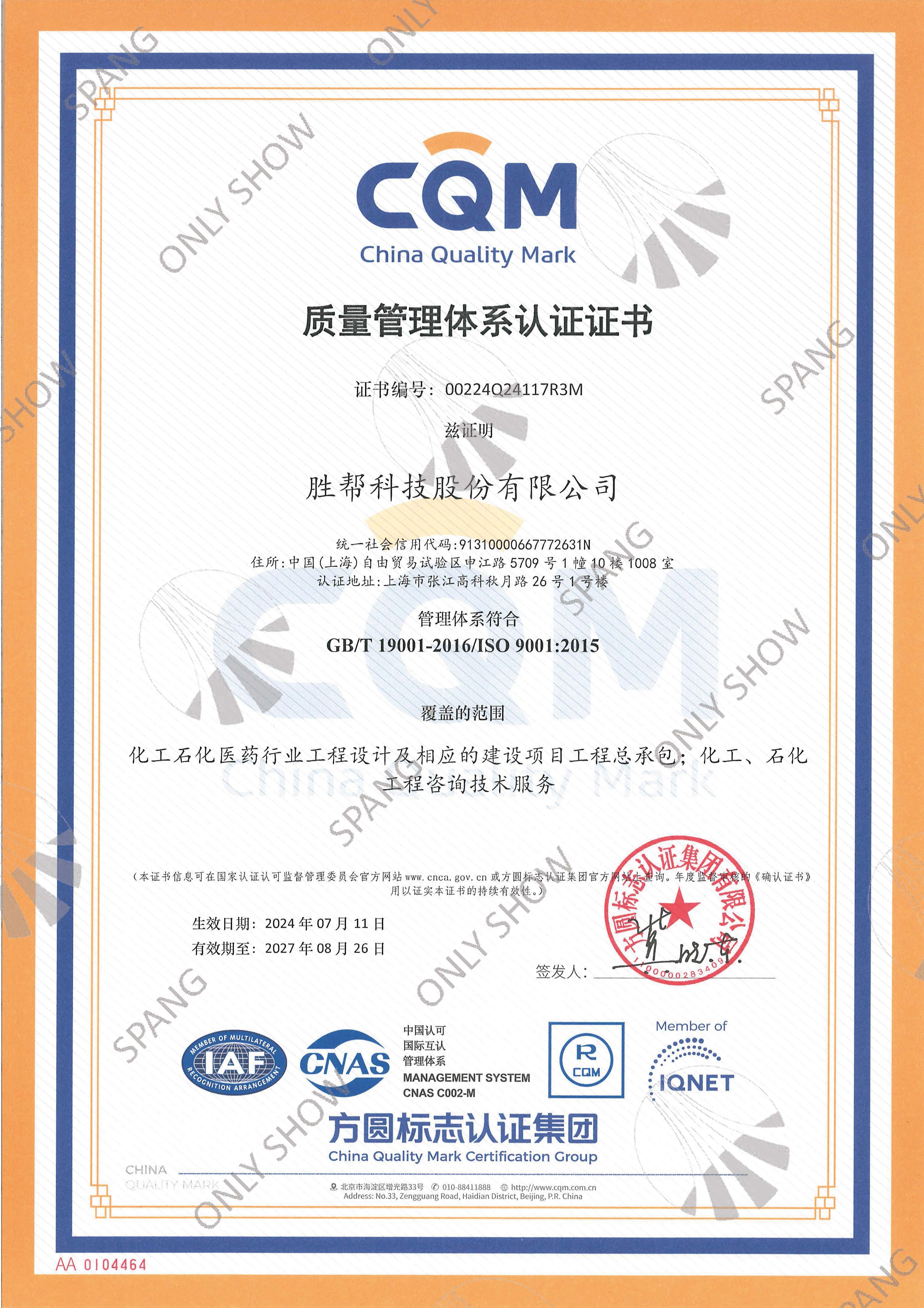 質(zhì)量管理體系證書(英文版)