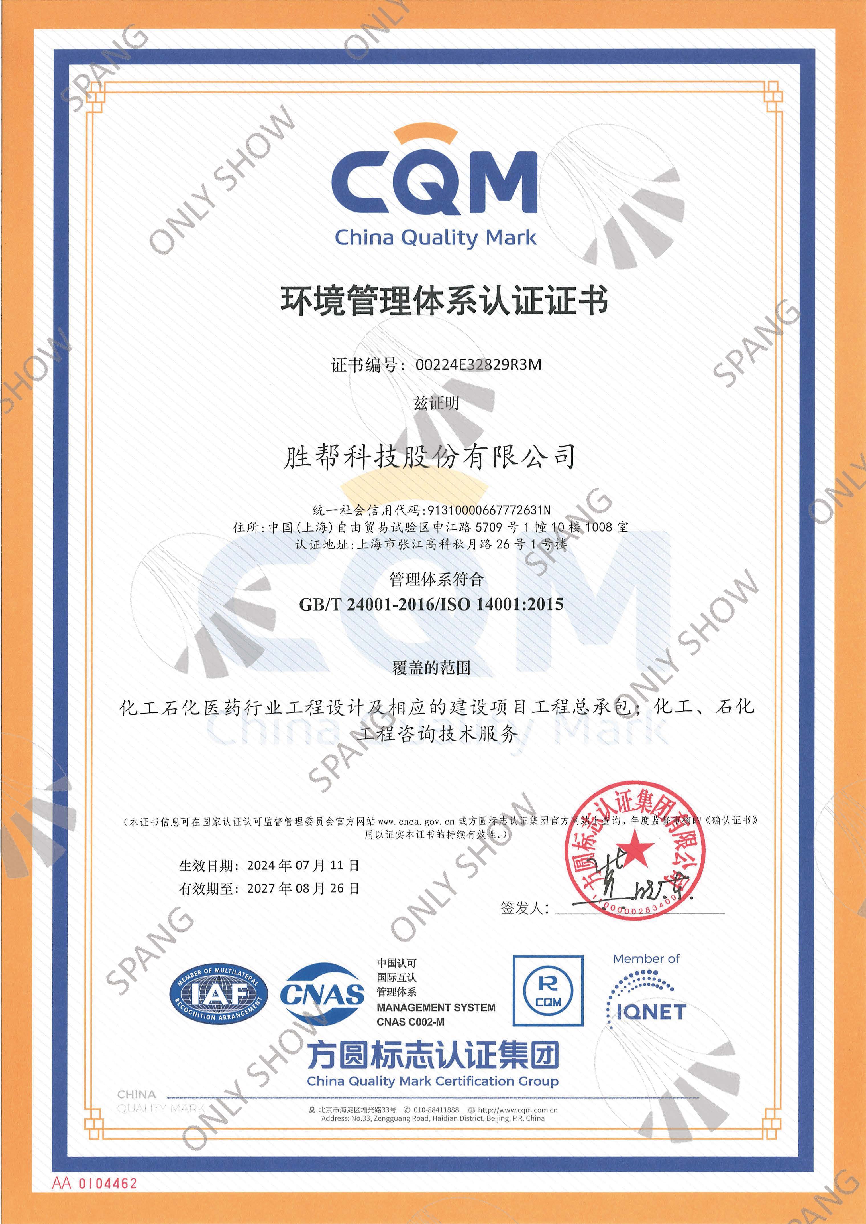 環(huán)境管理體系證書(英文版)
