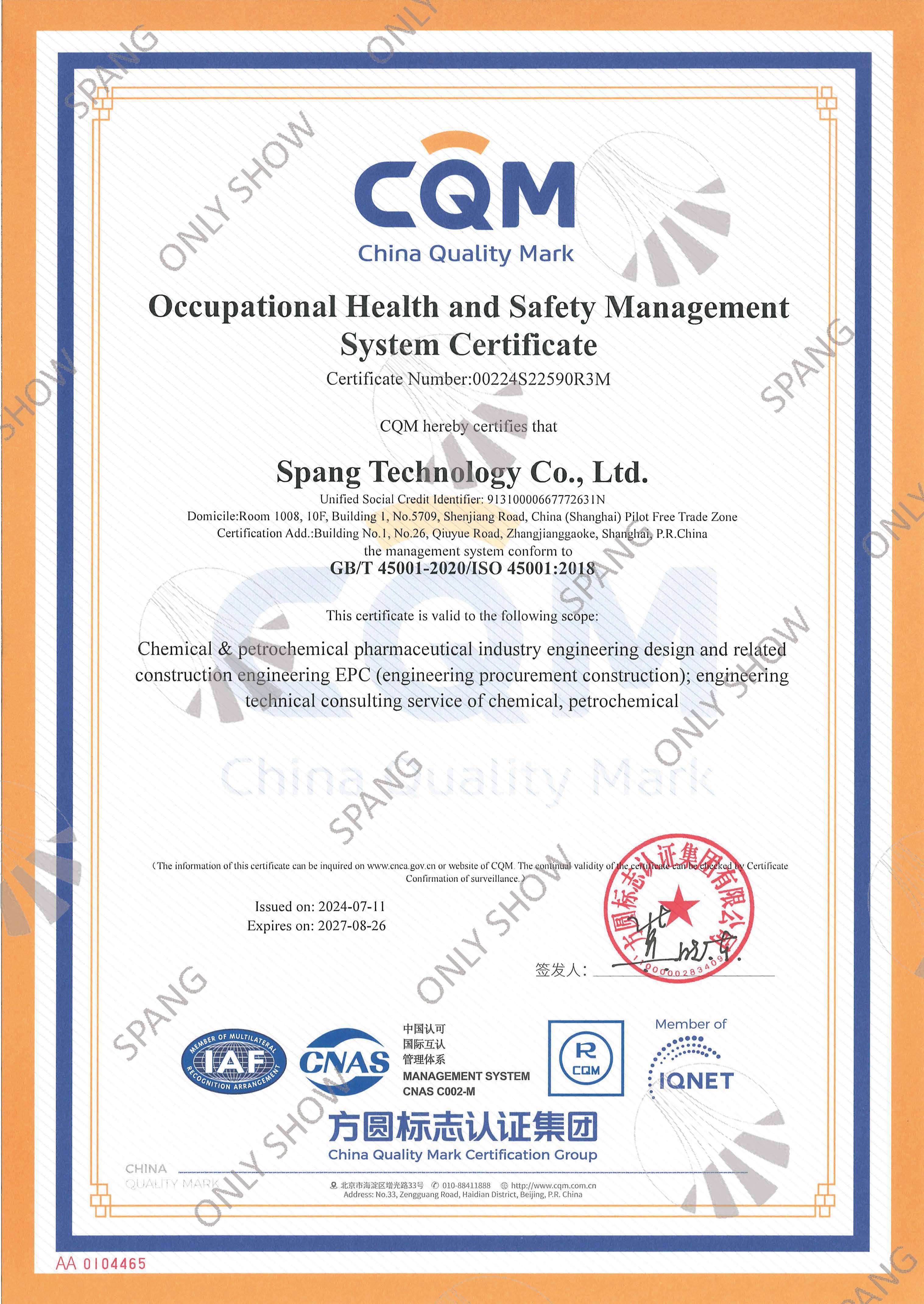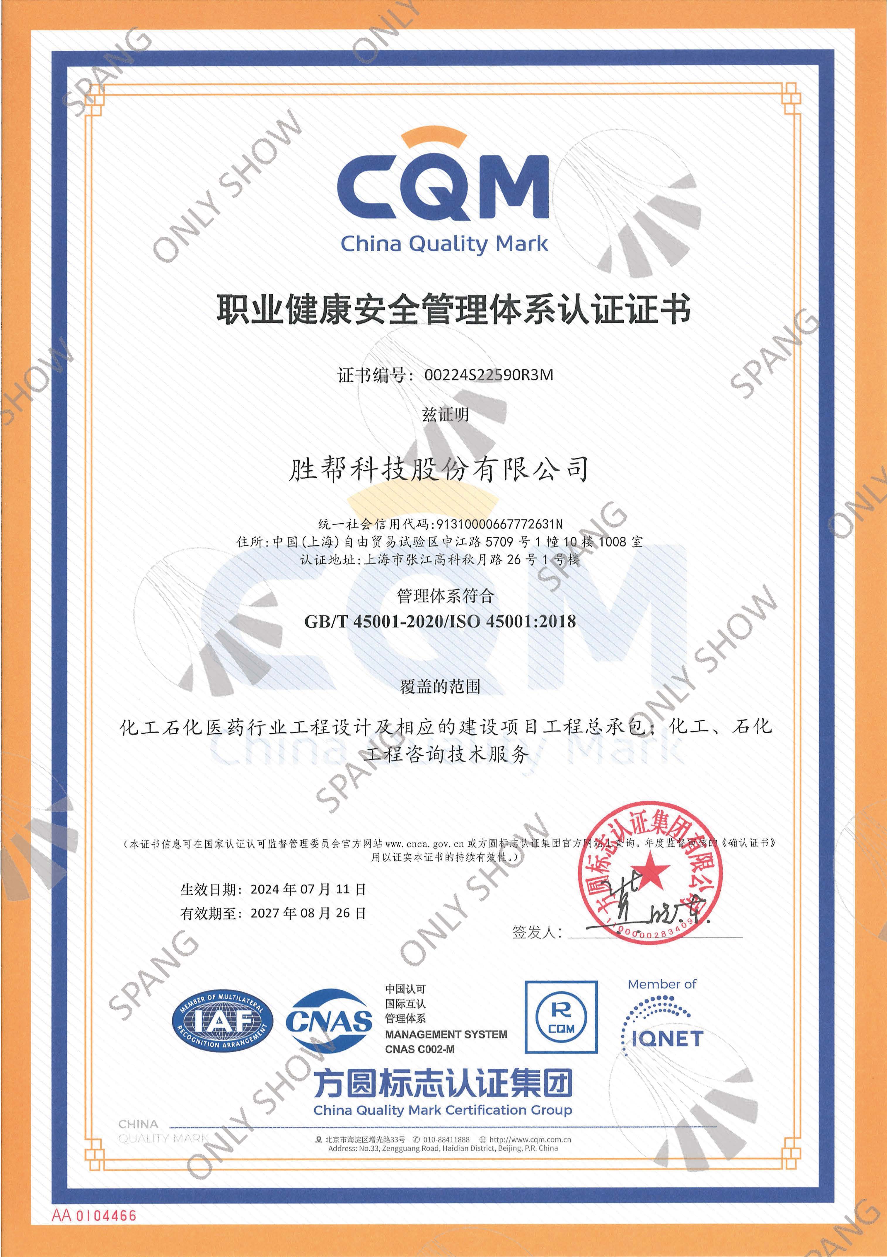職業(yè)健康安全管理體系證書(英文版)