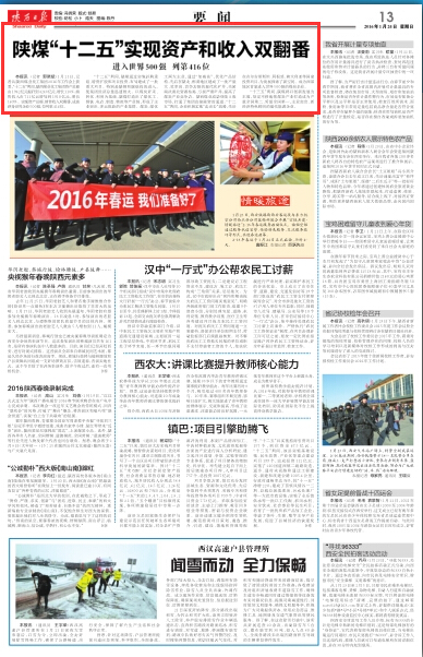 陜西日?qǐng)?bào):2016年1月24日 13版 陜煤“十二五”實(shí)現(xiàn)資產(chǎn)和收入雙翻番 進(jìn)入世界500強(qiáng) 列第416位 本報(bào)訊(記者 郭曉斌)1月21日,記者從陜西煤業(yè)化工集團(tuán)2016年工作會(huì)上獲悉,“十二五”期間,陜西煤業(yè)化工集團(tuán)資產(chǎn)總額由1942億元提升到4243億元,增長118%;銷售收入由711億元增加到1910億元,增長169%。實(shí)現(xiàn)資產(chǎn)總額、銷售收入雙翻番,成功躋身世界企業(yè)500強(qiáng),位列第416位。 …