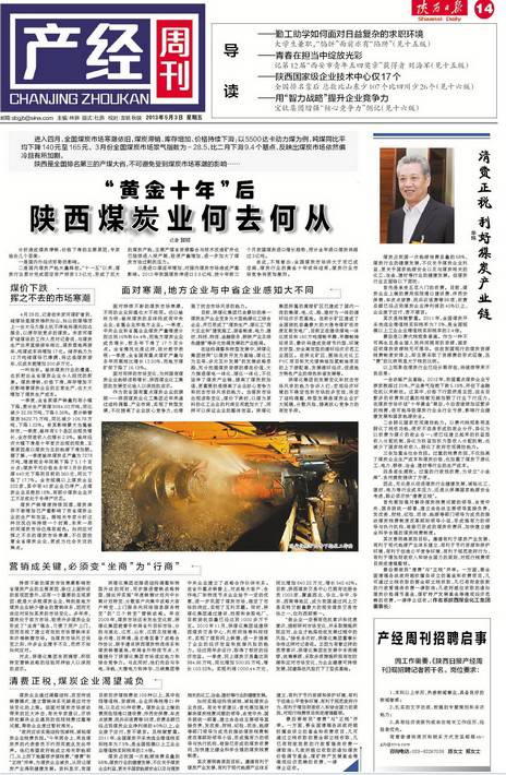 《陜西日報》2013年5月3日14版進入四月,全國煤炭市場寒潮依舊,煤炭滯銷、庫存增加、價格持續下滑:以5500達卡動力煤為例,噸煤同比平均下降140元至165元。3月份全國煤炭市場景氣指數為-28.5,比二月下滑9.4個基點,反映出煤炭市場依然偏冷且有所加劇。陜西作為全國排名第三的產煤大省,不可避免受到煤炭市場寒潮的影響……“黃金十年后”陜西煤炭業何去何從記者 賀韜 分析…