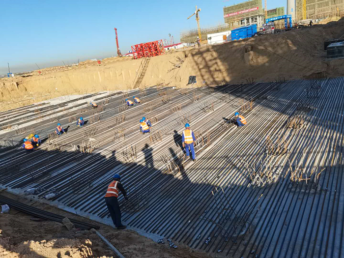 該筏板基礎鋼筋量417噸,混凝土量2950方,最大厚度為2.8米,屬于大體積混凝土工程。自樁基工程施工完成后,針對該區域周邊場地條件受限,原始地貌高出場平正負零1.2米及灌注樁施工周期較長的特點,現場項目部組織專業工程師和榆林源泰公司(破樁單位)召開專項會議,制定了專項的基坑開挖方案及計劃。