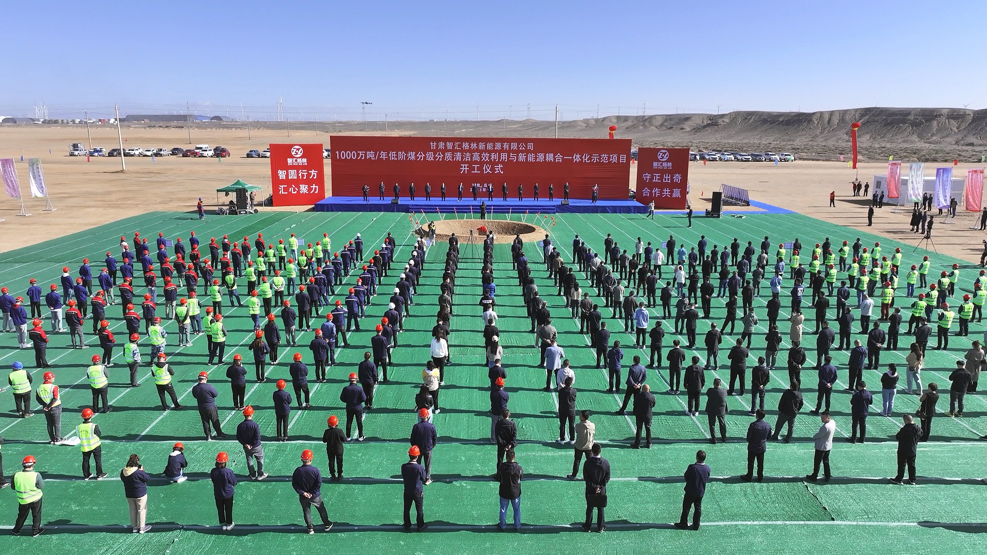 9月25日上午,甘肅智匯格林新能源有限公司1000萬噸/年低階煤分級分質清潔高效利用與新能源耦合一體化示范項目開工儀式舉行。酒泉市政府副市長石峰及市直部門,瓜州縣委、縣政府、人大、政協主要領導,業主甘肅智匯格林新能源公司、總承包單位勝幫科技公司負責人,項目施工人員等共500余人參加開工儀式。