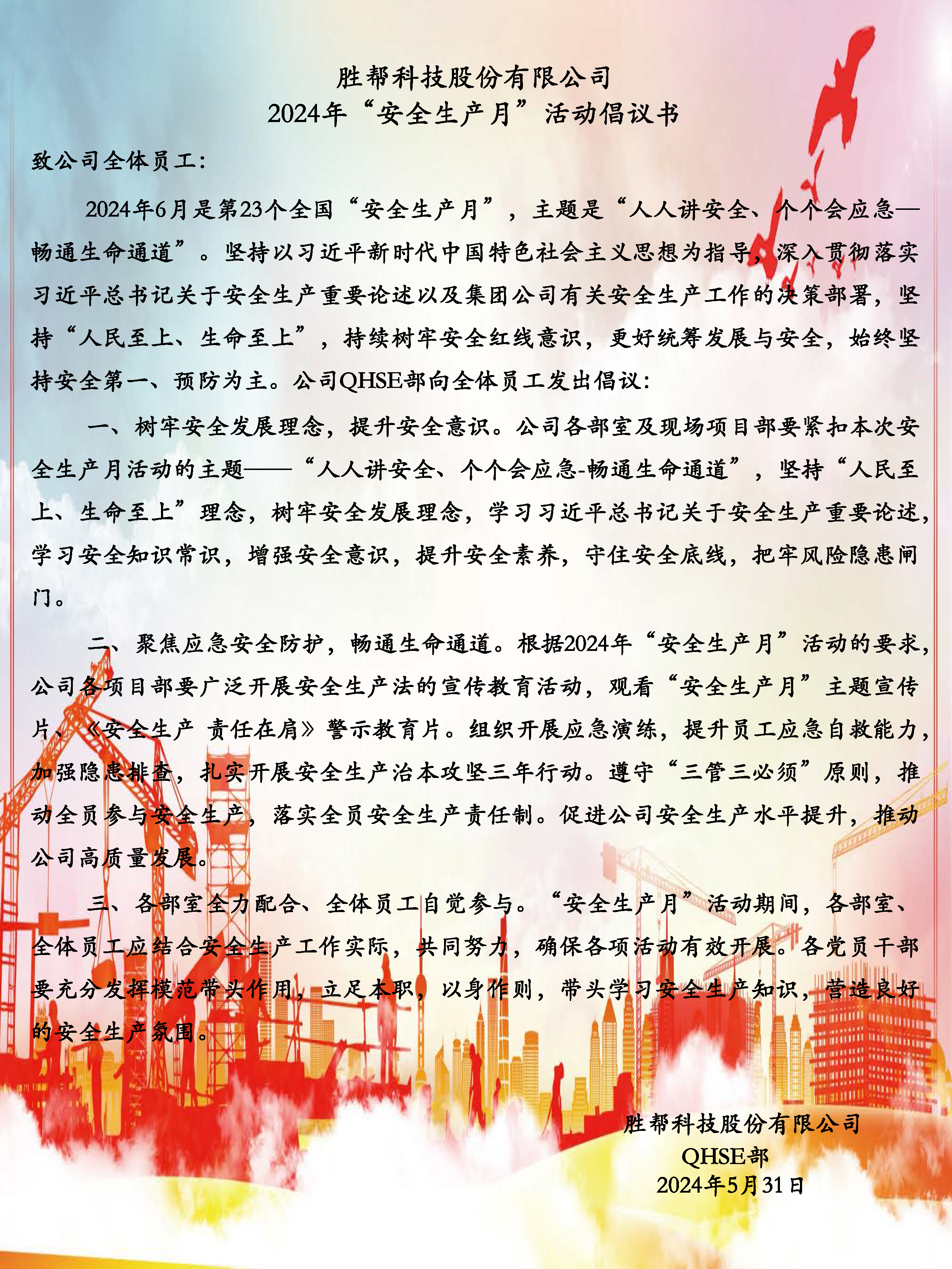 勝幫科技股份有限公司2024年“安全生產(chǎn)月”活動倡議書