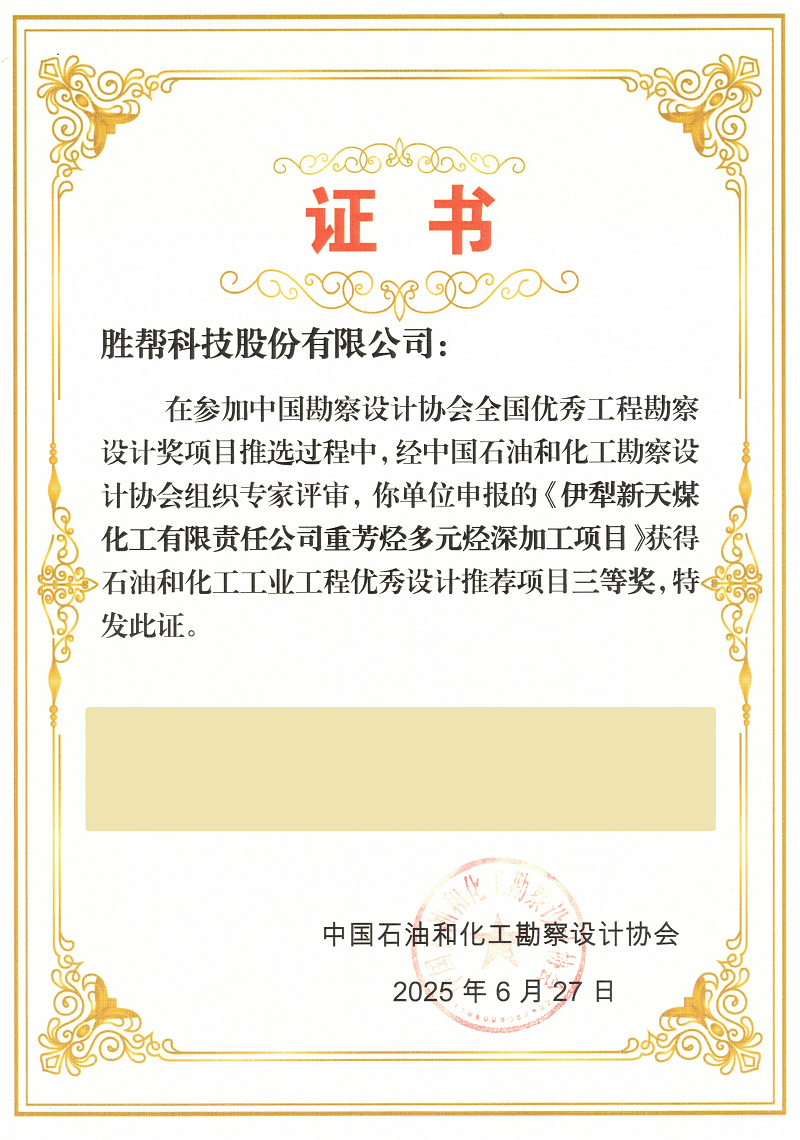本次評(píng)選吸引了行業(yè)內(nèi)眾多企業(yè)積極參與,共219個(gè)項(xiàng)目合規(guī)進(jìn)入專家評(píng)審范圍,經(jīng)過(guò)專家團(tuán)隊(duì)的嚴(yán)格評(píng)審,最終評(píng)選出一、二、三等獎(jiǎng)共計(jì)131項(xiàng),其中化工工程領(lǐng)域獎(jiǎng)項(xiàng)達(dá)90項(xiàng)。在此次評(píng)選中,勝幫科技憑借卓越的技術(shù)實(shí)力與工程創(chuàng)新能力,申報(bào)的兩大項(xiàng)目脫穎而出,雙雙榮獲“化工工程優(yōu)秀設(shè)計(jì)推薦項(xiàng)目三等獎(jiǎng)”, 獲獎(jiǎng)項(xiàng)目分別為: