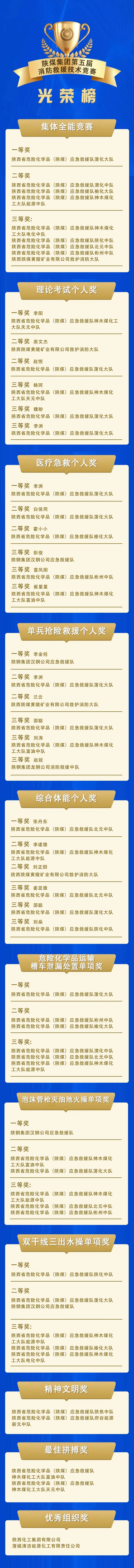 競賽共產生27個集體獎,24個個人獎,6個精神文明獎、最佳拼搏獎、優秀組織獎,以及5個優秀指揮員、25個中省級優秀裁判員、優秀裁判員。渭南市消防救援支隊、陜煤集團、陜西化工集團等相關領導出席閉幕式并頒獎。