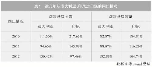 2012年是國際煤炭市場的拐點,這一年前3個月煤炭價格跌勢加劇,此后一直在低位。來自印尼的進口煤在2012年出現數量增長但金額下滑的局面。澳大利亞在2012年對中國煤炭出口出現雙增,但受國際煤價低迷影響,依然是金額增長低于數量增長。