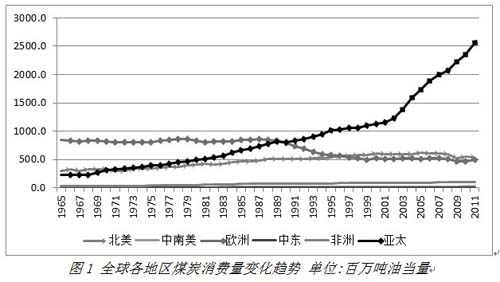 全球對煤炭的消費量在不同地區表現各異。歐洲煤炭消費在1979年達到頂峰,北美煤炭消費在2005年達到頂峰(兩地區占世界煤炭消費總量的27.7%)。其他地區煤炭消費尚未飽和,亞太地區煤炭消費增長十分迅猛。