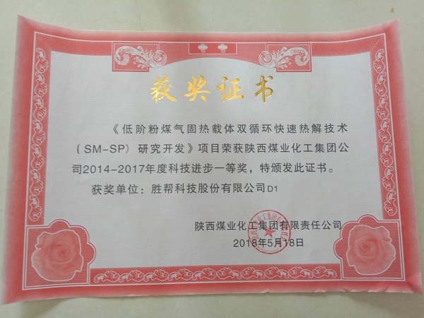 5月18日,陜煤集團(tuán)召開第五屆科技創(chuàng)新表彰大會(huì)暨科技創(chuàng)新推進(jìn)會(huì),勝幫科技股份有限公司憑借“低階粉煤氣固熱載體雙循環(huán)快速熱解技術(shù)(SM-SP)研究開發(fā)”項(xiàng)目,喜獲2014-2017年度創(chuàng)新成果類—“科技進(jìn)步獎(jiǎng)一等獎(jiǎng)”。